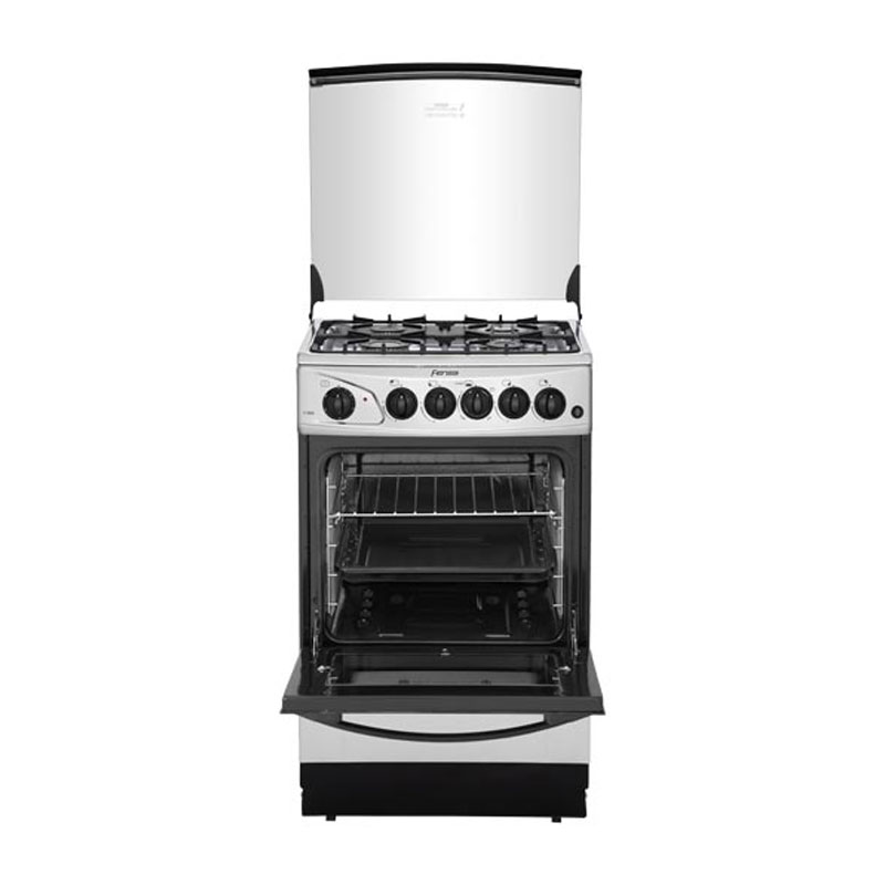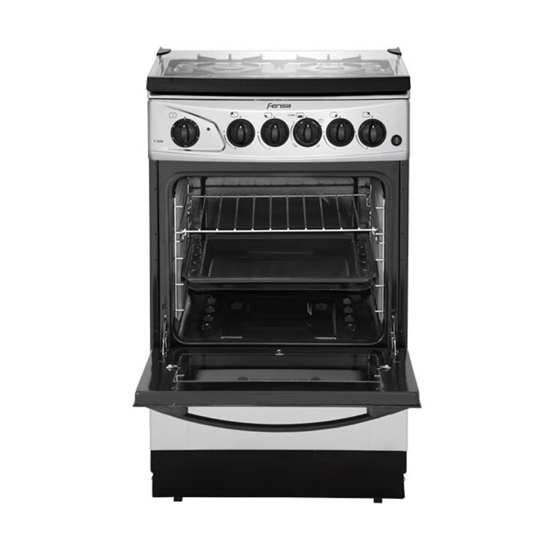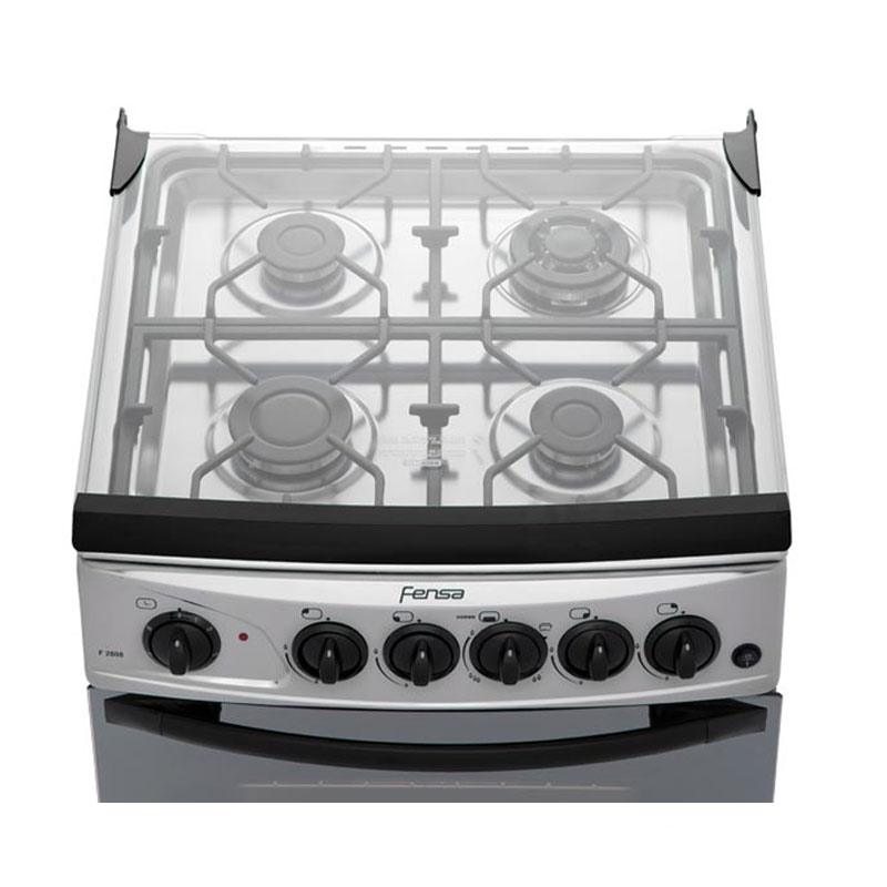 Cocina modelo F 2808 de Fensa que posee quemador triple corona en cubierta y tapa de cristal templado. Cuenta con encendido eléctrico en cubierta y horno, timer, puerta de horno de cristal templado reflectivo doble vidrio, luz en el horno y mayor altura. Ideal para integrarla a tu hogar.