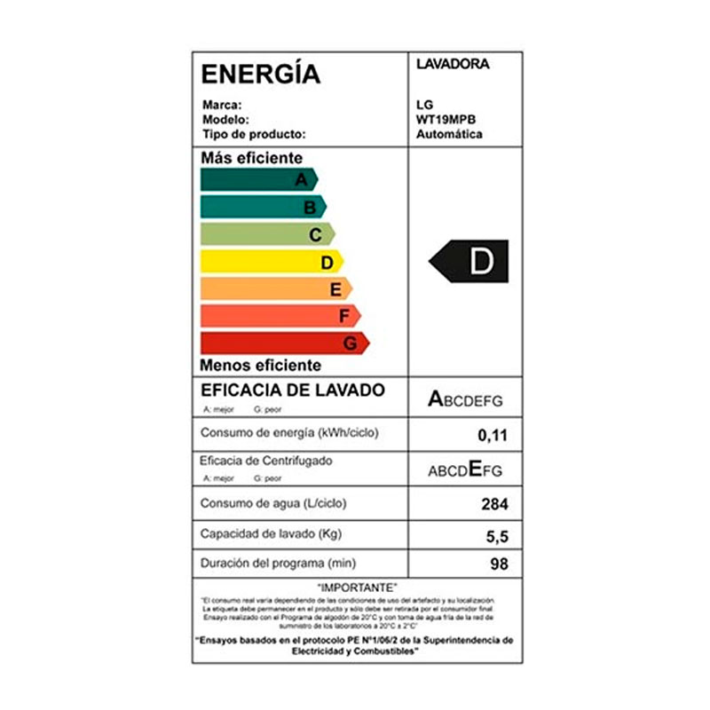Consumo energético: 0.11 kWh/Ciclo