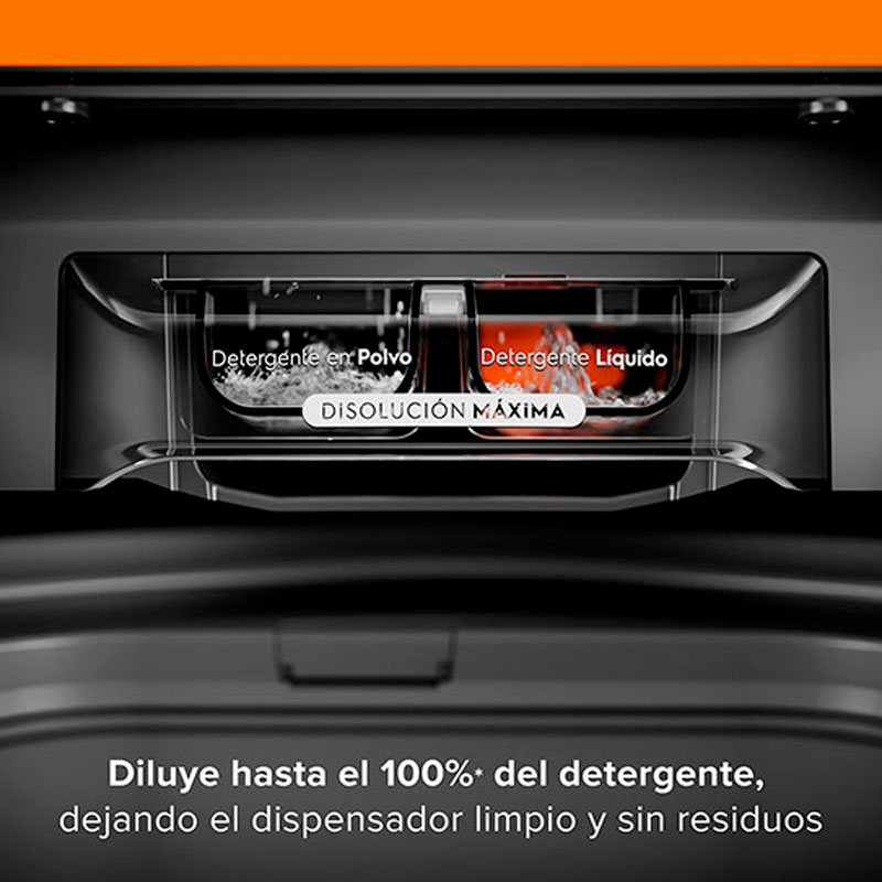 Optimizando al máximo la acción del detergente con tecnología, el Dispenser Disolución Máxima garantiza que los detergentes y suavizantes se disuelvan por completo antes de entrar en contacto con los tejidos proporcionando un lavado más suave y eficaz. El dispenser diluye hasta el 100%¹ del detergente, dejando el dispensador limpio y sin residuos.