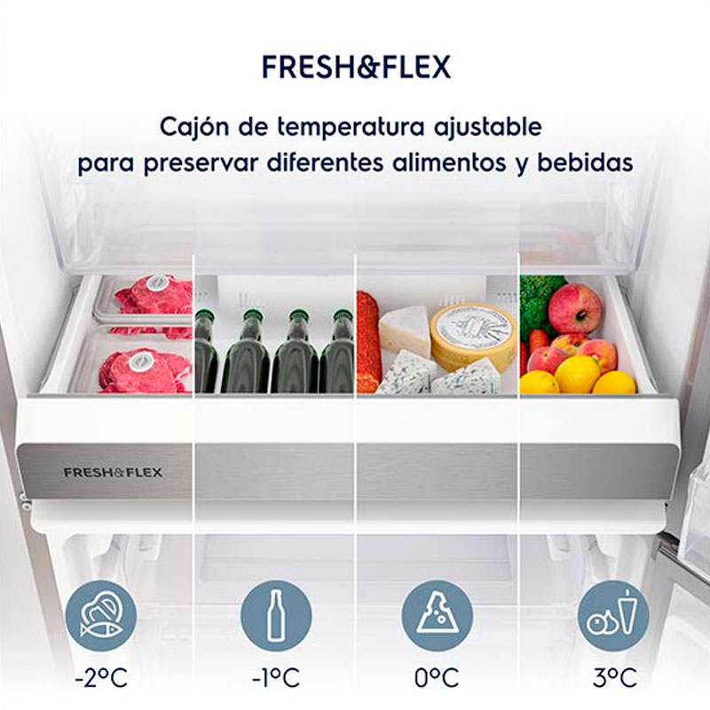 El Refrigerador Bottom Freezer Experience con Fresh&Flex te ofrece alta tecnología en el cuidado de tus alimentos por mucho más tiempo.